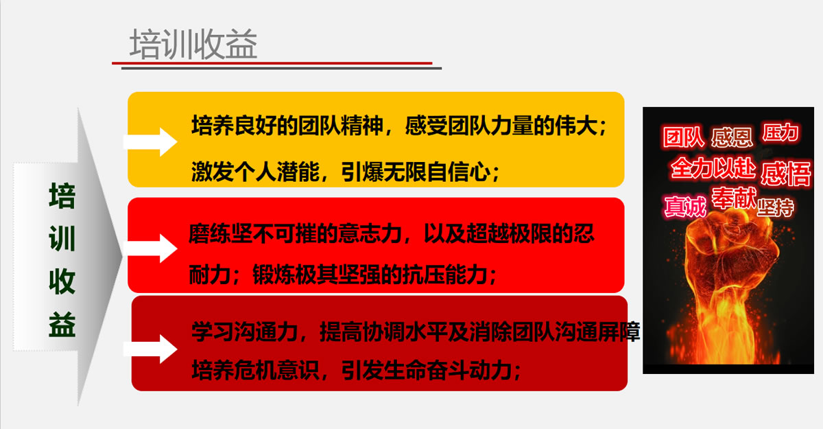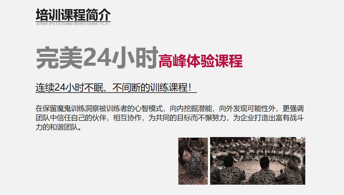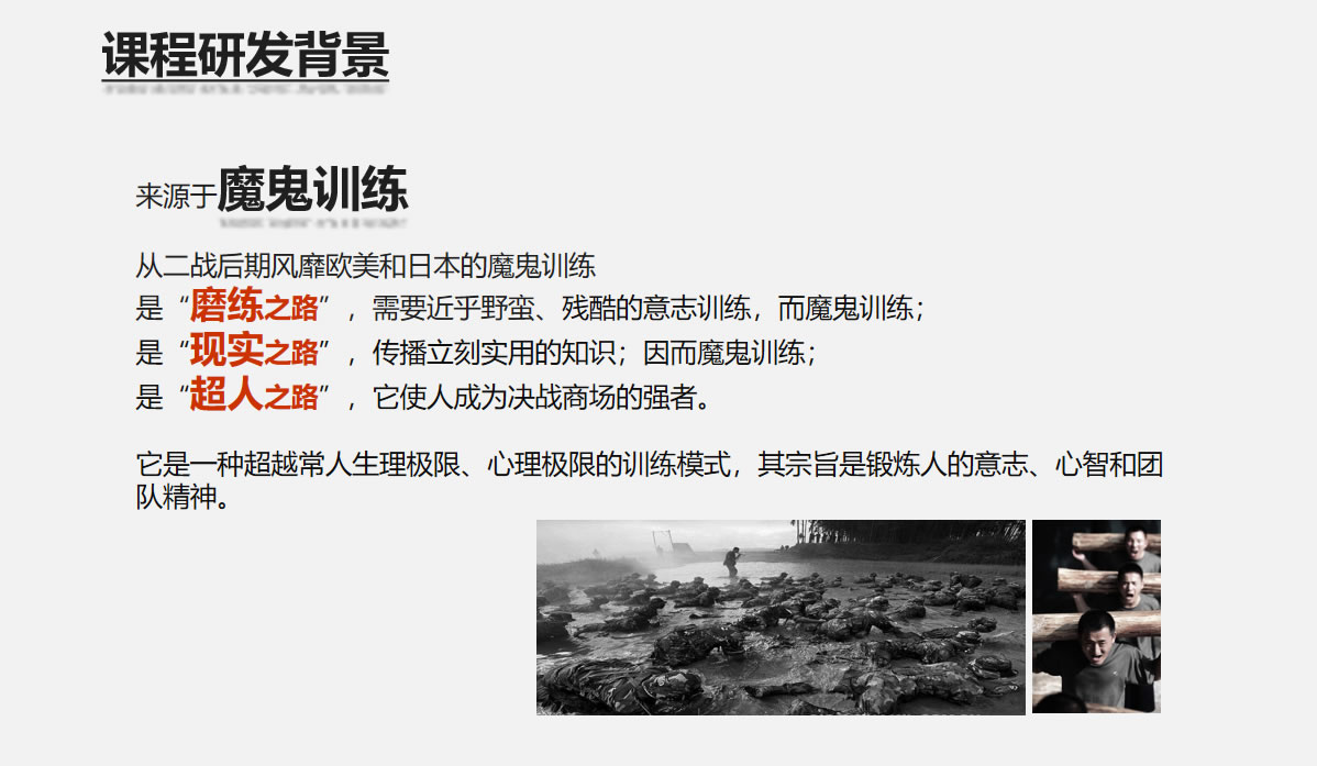 “速度”、“變化”、“創(chuàng)新”已經(jīng)成為這個(gè)時(shí)代的符號(hào),“弱肉強(qiáng)食,快與慢吃”已經(jīng)成為企業(yè)在競(jìng)爭(zhēng)道路上無(wú)法回避的殘酷現(xiàn)實(shí)。此課程引領(lǐng)大家感受軍營(yíng)的嚴(yán)謹(jǐn)文化,體驗(yàn)高強(qiáng)度的紀(jì)律、執(zhí)行與責(zé)任。通過(guò)對(duì)全體學(xué)員進(jìn)行基礎(chǔ)的軍事化項(xiàng)目體驗(yàn),向部隊(duì)學(xué)習(xí),使學(xué)員完全放下平時(shí)工作生活中頭上的光環(huán),像軍人一樣嚴(yán)格要求自己,完全服從于團(tuán)隊(duì)的目標(biāo)與利益,實(shí)現(xiàn)團(tuán)隊(duì)價(jià)值,進(jìn)而實(shí)現(xiàn)個(gè)人價(jià)值。