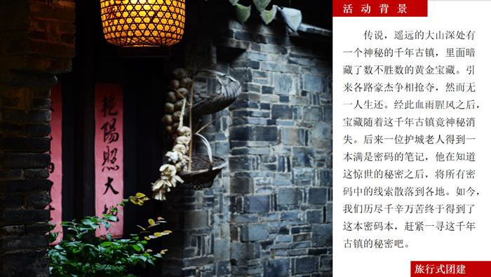 利用目的地的風(fēng)土民情,以及周邊的獨(dú)特地形地貌,結(jié)合活動(dòng)的主要目標(biāo),設(shè)計(jì)以特定主題作為主線的經(jīng)典文化定向活動(dòng)。一方面強(qiáng)化本次活動(dòng)的主題,使之更加深入人心,同時(shí)在活動(dòng)的過(guò)程中進(jìn)一步熔煉團(tuán)隊(duì)精神,另一方面也讓員工通過(guò)另外一種獨(dú)特的方式了解目的地的一些名勝古跡,風(fēng)土民情,即達(dá)到了融合團(tuán)隊(duì)的目的,又不留痕跡,形式上不失活潑,跳出了傳統(tǒng)拓展訓(xùn)練的框架,以全新的方式向人們展示企業(yè)員工的風(fēng)采!