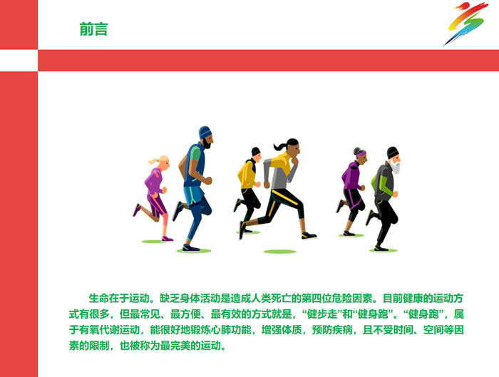 健步走是一項(xiàng)以促進(jìn)身心健康為目的、講究姿勢(shì)、速度和時(shí)間的一項(xiàng)步行運(yùn)動(dòng),它行走的速度和運(yùn)動(dòng)量介于散步和競(jìng)走之間。突出的特點(diǎn)是方法易于掌握,不易發(fā)生運(yùn)動(dòng)傷害;不受年齡、時(shí)間和場(chǎng)地的限制,不同年齡人群可根據(jù)自己的時(shí)間隨時(shí)隨地進(jìn)行鍛煉;運(yùn)動(dòng)裝備簡(jiǎn)單,只需一雙舒適合腳的運(yùn)動(dòng)鞋;在良好自然環(huán)境中結(jié)伴健步走,不僅鍛煉了身體,還能欣賞自然美景,促進(jìn)人際交流,陶冶身心??梢越Y(jié)合開(kāi)展定向闖關(guān)形式開(kāi)展各類型主題活動(dòng)。