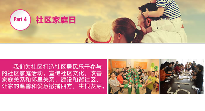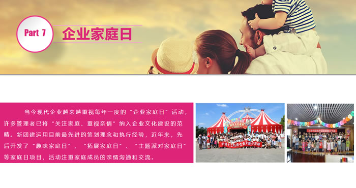 依家庭日是企業(yè)員工攜家屬共同參與的歡樂盛會,在輕松愉快的環(huán)境中,使員工和家屬充分體驗企業(yè)文化,增進員工之間的交流互動,和對企業(yè)的歸屬感和凝聚力。 豐富精彩的家庭日活動,將企業(yè)文化與家庭文化融合,激發(fā)員工及其家屬的自豪感,幫助員工贏得親人的鼓勵與支持,為企業(yè)創(chuàng)造更健康快樂的工作氛圍。