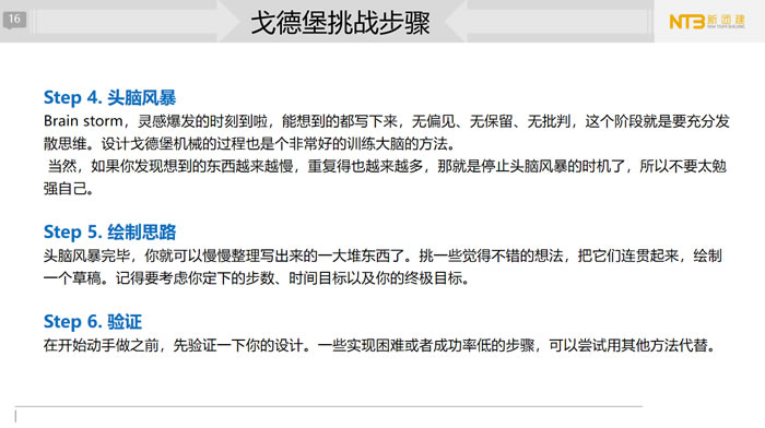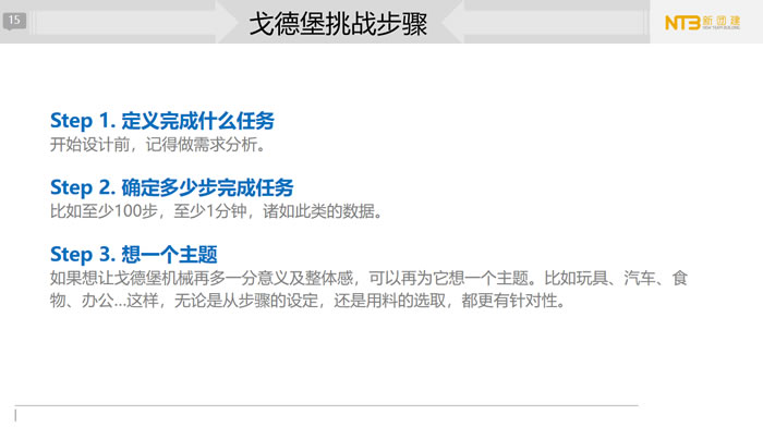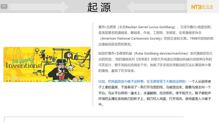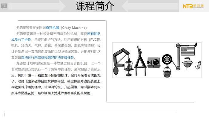 戈德堡裝置是一種設(shè)計(jì)精密而復(fù)雜的機(jī)械,需要所有團(tuán)隊(duì)成員分工協(xié)作,用迂回曲折的方法,利用有限的材料(PVC管、電機(jī)、冷焰火、氣球、滑輪、多米諾骨牌、滑輪等等道具)設(shè)計(jì)并制造出一套精確而復(fù)雜的巨型戈德堡裝置,并能夠利用這套裝置自動(dòng)運(yùn)行來(lái)完成設(shè)想好的動(dòng)作或任務(wù)。戈德堡計(jì)劃中的裝置是一種故意過度設(shè)計(jì)的機(jī)器,以一個(gè)非常復(fù)雜的方式執(zhí)行一個(gè)非常簡(jiǎn)單的任務(wù),通常包括了連鎖反應(yīng)。例如:碰一下右圖左下角的橄欖球,會(huì)打開裝著老鷹的籠子,老鷹飛出來(lái)碰掉自由女神像模型,模型掉到旁邊的裝置上,導(dǎo)致黑球掉落到桶中,帶動(dòng)滑輪組,升起國(guó)旗,同時(shí)推動(dòng)熨斗,熨斗點(diǎn)燃禮花捻,最終畫面上處處散落著喜慶的星星雨