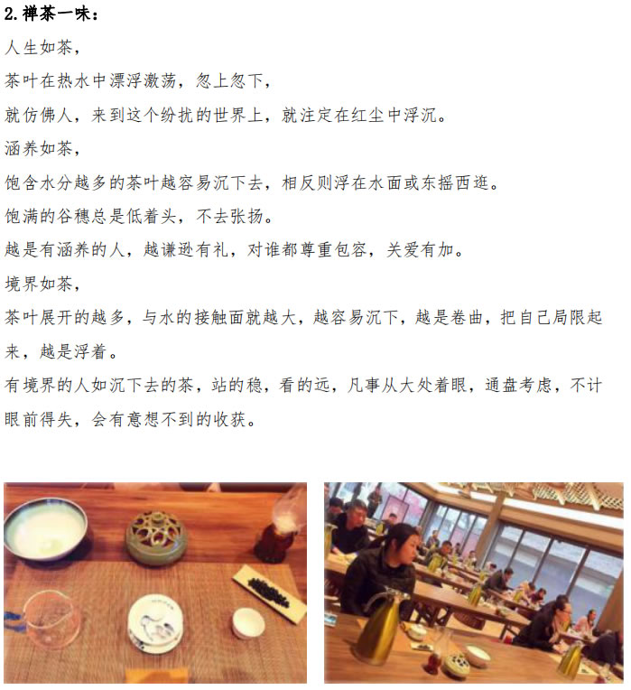 茶與中國人的生活有著千絲萬縷的聯(lián)系。茶禪的結(jié)合,是中國文化史上一道奇特的景觀。“吃茶去”、“茶禪一味”、“和敬清寂”等等,已經(jīng)成為禪茶文化的經(jīng)典話語。一杯茶中,禪意盎然,有人生的三昧、有佛學(xué)的感悟、有茶人的心情與品味。在現(xiàn)代語境中,禪茶真諦正具有越來越重要的文化意義。古人云:茶是儒、是仁、義、禮、智、信;茶是佛,是來世凈土的精神寄托;茶是道,是樂天知足的自我心靈慰藉;茶是和,充滿著怡情溫柔,至善至美;茶是靜,充滿著清淡天和,養(yǎng)精蓄銳。
