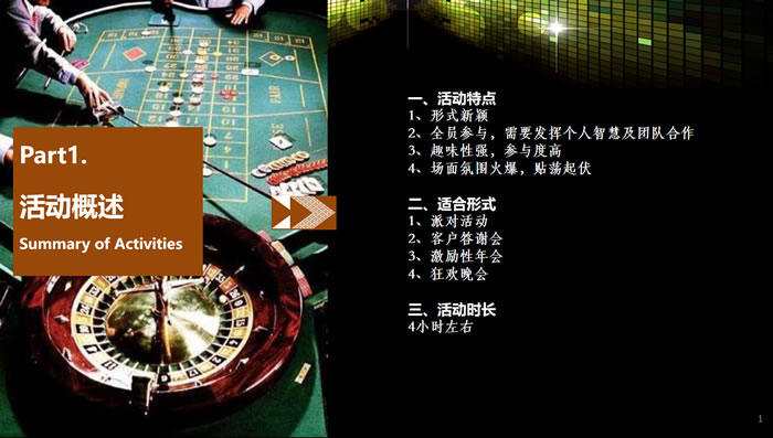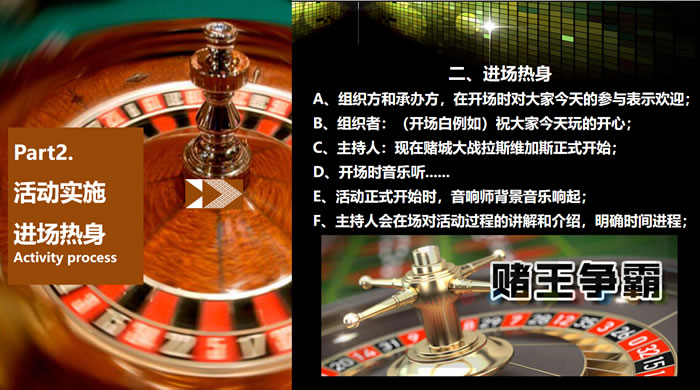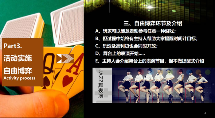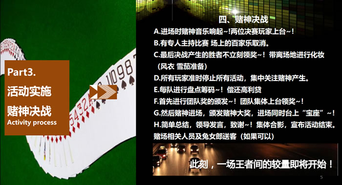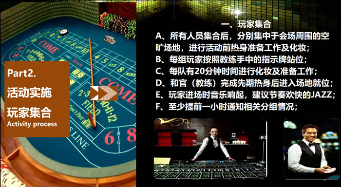 團(tuán)隊(duì)成員盛裝進(jìn)入一個(gè)以“拉斯維加斯某賭場(chǎng)”為虛擬 背景的世界中,進(jìn)行分組后,各組進(jìn)行“賭博競(jìng)賽”。每個(gè) 團(tuán)隊(duì)中,成員通過(guò)學(xué)習(xí)“舞蹈”、“舞臺(tái)劇”等形式賺取虛擬貨幣,參與者在這個(gè)虛擬的世界中酣暢淋漓地“賭”了一把,又可以獲得唯美的享受……